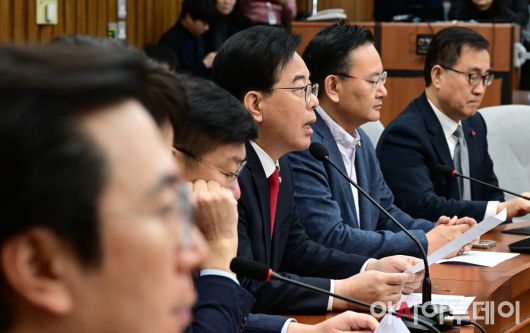 아시아투데이 이병화 기자 = 송언석 국민의힘 원내대표가 23일 국회에서 열린 원내대책회의에서 모두발언을 하고 있다.
