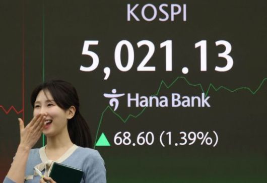 코스피가 장중 5021.13으로 사상 최고가를 경신한 가운데 23일 서울 중구 하나은행 본점 딜링룸에서 직원이 증시와 환율 등을 모니터하고 있다. 이날 코스피는 전 거래일(4952.53)보다 31.55포인트(0.64%) 상승한 4984.08에 장을 시작했다. <ⓒ투자가를 위한 경제콘텐츠 플랫폼, 아시아경제(www.asiae.co.kr) 무단전재 배포금지>