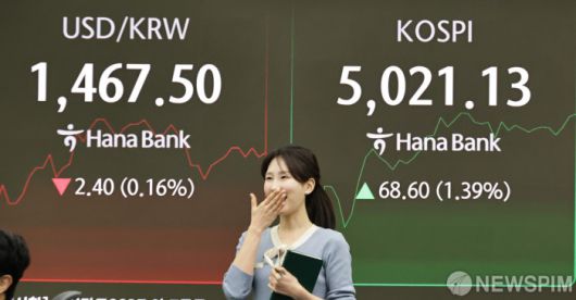 [서울=뉴스핌] 양윤모 기자 = 23일 오전 코스피가 전장 종가보다 68.60 포인트(1.39%) 상승하며 5021.41으로, 코스닥은 7.18포인트(0.74%) 상승한 977.53으로 장을 시작한 가운데, 서울 중구 하나은행본점 딜링룸에서 직원들이 업무를 보고 있다. 서울외환시장에서 달러/원 환율은 전장 대비 2.40원 하락한 1467.60원에 주간거래를 시작했다. 2026.01.23 yym58@newspim.com
