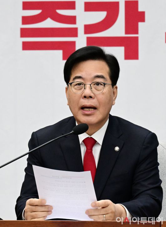 아시아투데이 이병화 기자 = 송언석 국민의힘 원내대표가 23일 국회에서 열린 원내대책회의에서 모두발언을 하고 있다.