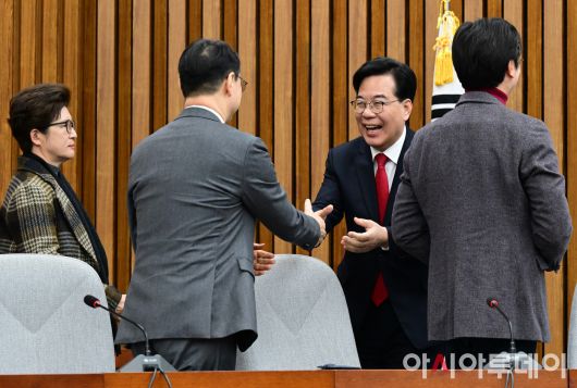 아시아투데이 이병화 기자 = 송언석 국민의힘 원내대표가 23일 국회에서 열린 원내대책회의에 참석하고 있다.