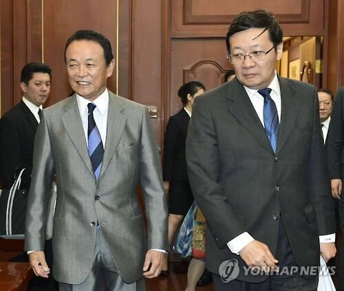 2015년 6월 베이징에서 아소 다로(麻生太郞, 왼쪽) 일본 부총리 겸 재무상과 러우지웨이(樓繼偉) 중국 재정부장이 재무대화에 임하고 있다./연합뉴스 |