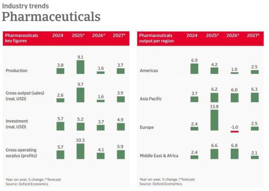 미국은 작년 의약품 생산량이 5.2% 성장했으나 올해에는 0.9%로 둔화될 것으로 예상되며, 내년에는 2.5% 증가해 반등할 것으로 전망된다.