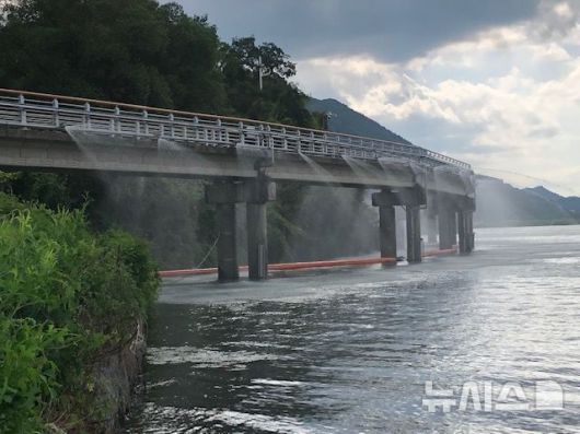 [창원=뉴시스]경남 창원특례시 의창구 동읍 본포마을과 창녕군 부곡면 학포리를 잇는 낙동강 다리 '본포교' 아래 쪽에 있는 '낙동강 본포취수장'의 살수장치 가동 모습.(자료사진=경남도 제공) 2025.06.04. photo@newsis.com |