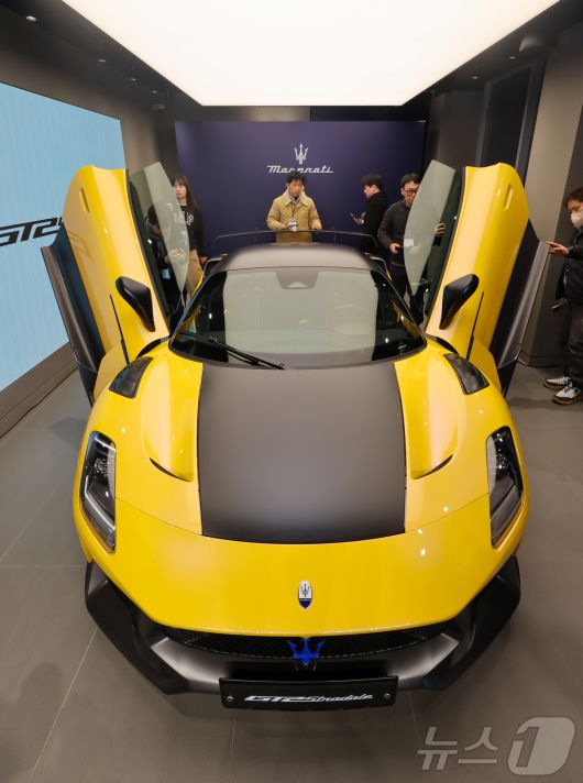 (성남=뉴스1) 안은나 기자 = 마세라티 코리아 고성능 슈퍼 스포츠카 ‘GT2 스트라달레(Stradale)’ 공식 출시 행사가 열린 22일 경기 성남시 분당구 마세라티 판교 전시장에 차량이 진열돼 있다. 이탈리아 모데나에서 100% 한정 주문 생산 방식으로 제작되는 GT2 스트라달레는 레이싱 퍼포먼스 구현을 위해 차중량을 MC20 대비 59kg 줄였으며, 공기 흐름을 정교하게 다듬은 바디 패키지, 대형 리어 윙 등은 280km/h의 고속 주행 시 최대 500kg에 달하는 다운포스를 생성한다. 2026.1.23/뉴스1