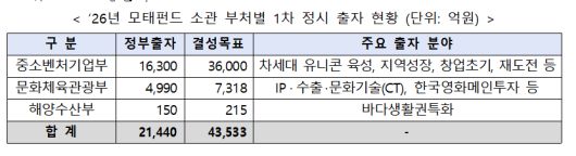 중소벤처기업부는 23일 문화체육관광부, 해양수산부, 한국벤처투자와 함께 ‘모태펀드 2026년 1차 정시 출자 공고’를 통해 이 같은 내용을 발표했다.