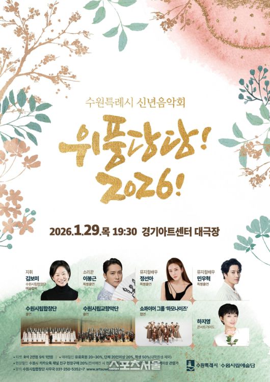 시 관계자는 “신년음악회 ‘위풍당당! 2026!’는 장르와 세대를 아우르는 구성으로 수원시의 문화적 역량과 예술적 비전을 보여주는 무대”라며 “음악으로 희망과 용기를 전하는 이번 음악회에 많은 시민이 함께해 주시길 바란다”고 말했다.