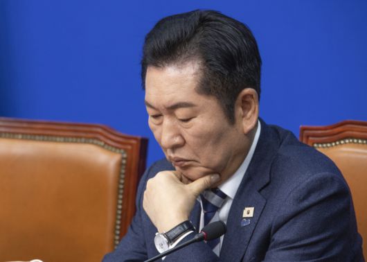 정청래 더불어민주당 대표가 19일 국회에서 열린 최고위원회의 도중 생각에 잠겨 있다. 연합뉴스 |
