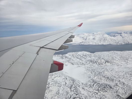 22일(현지시간) 그린란드 수도 누크행 비행기에서 내려다본 눈 덮인 그린란드. 연합뉴스 |