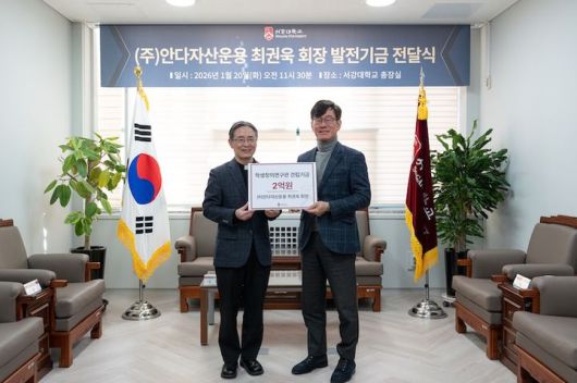 [서울=뉴시스] 심종혁(왼쪽) 서강대 총장과 최권욱 안다자산운용 회장이 기금 전달식에서 기념 촬영을 하고 있다. (사진=서강대 제공) 2026.01.23. photo@newsis.com *재판매 및 DB 금지 |