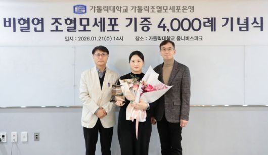 [이데일리 이순용 기자] 가톨릭대학교 가톨릭조혈모세포은행(은행장 정연준 교수, 가톨릭대학교 의과대학 미생물학교실)이 비혈연 간 조혈모세포 기증 4,000례를 달성했다. 이를 기념하여 1월 21일(수) 가톨릭대학교 옴니버스 파크에서 기념행사가 열렸으며, 정연준 은행장을 비롯해 김유진 서울성모병원 혈액병원장, 실제 기증에 참여한 4,000번째 기증자 배진실 간호사(서울아산병원 암병원), 관련 의료진과 교직원들이 함께했다.