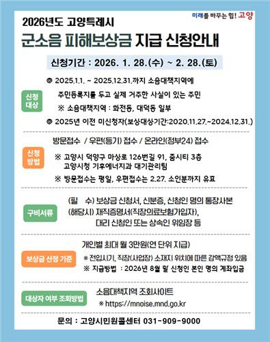 고양특례시(시장 이동환)는 오는 28일부터 2월 28일까지 군 소음대책지역에 대한 '2026년도 군소음 피해보상금 신청'을 받는다고 밝혔다.