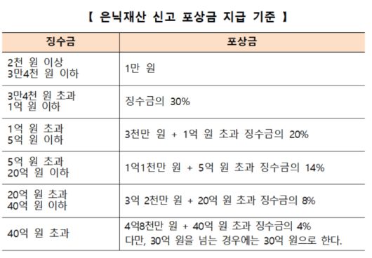 또 은닉 재산 신고포상금도 지난해 12월 23일부터 최고액을 20억 원에서 30억 원으로 높였다.