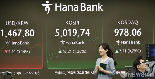 [서울=뉴스핌] 양윤모 기자 = 23일 오전 코스피가 전장 종가보다 67.21 포인트(1.36%) 상승하며 5019.74로, 코스닥은 7.71포인트(0.79%) 상승한 978.06으로 장을 시작한 가운데, 서울 중구 하나은행본점 딜링룸에서 직원들이 업무를 보고 있다. 서울외환시장에서 달러/원 환율은 전장 대비 2.10원 하락한 1467.80원에 주간거래를 시작했다. 2026.01.23 yym58@newspim.com