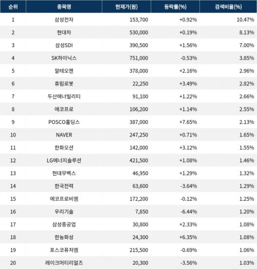 이어 현대차(005380)가 검색비율 2위를 기록하며 0.19%의 등락률을 보이고 있다. 검색비율 3위의 삼성SDI(006400)는 1.56% 상승하며 순조롭게 출발하는 모습이다. 검색비율 4위 SK하이닉스(000660)는 개장 초반부터 0.53%의 하락률을 기록 중이다. 검색비율 5위 알테오젠(196170)은 2.16% 상승하며 강세를 보이고 있다.