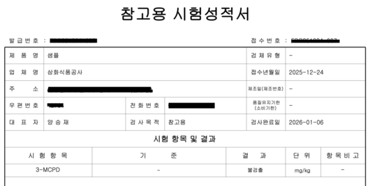 삼화식품은 “‘3-MCPD’ 기준치 초과 검출은 분석업체인 한국식품과학연구원과 ㈜동진생명연구원의 분석 결과과 다른 점을 이해할 수 없다”며 ㈜동진생명연구원에 자체 의뢰한 시험성적서를 공개했다.