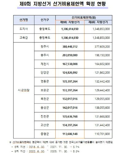 충청북도선거관리위원회가 23일 9회 전국동시지방선거 후보자의 선거운동 지출 비용 한도액(선거비용 제한액)을 공고했다.