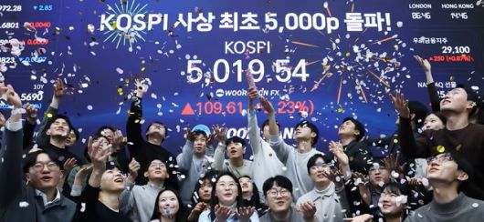 한국 증시가 사상 처음으로 '코스피 5000' 쾌거를 달성한 지난 22일 서울 중구 우리은행 본점 딜링룸에서 직원들이 장중 최고가가 찍힌 전광판을 배경으로 코스피 5000 돌파를 축하하고 있다. [사진=뉴스1] |