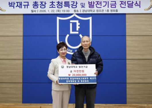 경남대학교 행정대학원 통일미래최고위과정 제15기 총학생회는 지난 22일 창조관에서 모교 대학발전기금으로 2000만원을 쾌척했다.