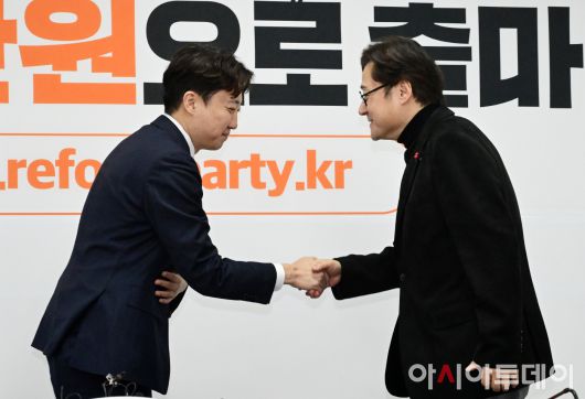 아시아투데이 이병화 기자 = 이준석 개혁신당 대표가 23일 국회를 찾은 홍익표 청와대 신임 정무수석과 악수를 나누고 있다.