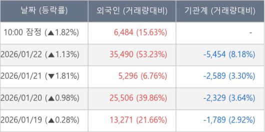[서울=뉴스핌] 로보뉴스 = 23일 10시 15분 현재 동국홀딩스(001230)는 전일 대비 1.82% (현재가 7,260원) 상승했고, 외국인이 최근 5일 연속 순매수(누적 86,047주, 잠정) 행진을 하고 있다.
