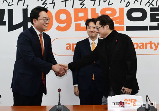 아시아투데이 이병화 기자 = 이준석 개혁신당 대표와 천하람 원내대표가 23일 국회를 찾은 홍익표 청와대 신임 정무수석을 접견하고 있다.