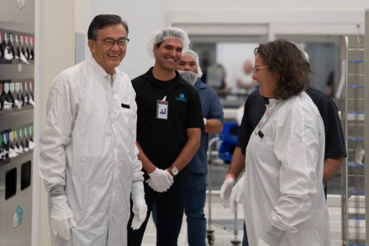 인텔 CEO 립부 탄이 2025년 10월 인텔 18A 프로세서를 생산하는 신규 공장을 둘러보기 위해 애리조나주 챈들러에 위치한 팹 52에서 클린룸 버니 슈트를 착용하고 있다. 인텔 파운드리 제조 및 공급망 담당 부사장이자 애리조나 공장 관리자인 지빗 카츠-차메렛(오른쪽)도 함께 둘러보고 있다. 사진=인텔 |