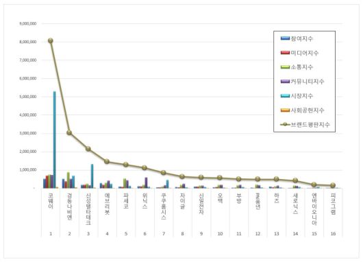 브랜드평판지수는 브랜드 빅데이터 분석을 통해 소비자들의 긍부정 평가, 미디어 관심도, 소비자의 참여와 소통량, 소셜 대화량, 시장평가, 사회가치활동 등을 측정하는 지표다. 정성적인 분석 강화를 위해 ESG 관련 지표와 오너리스크 데이터도 함께 반영됐다.