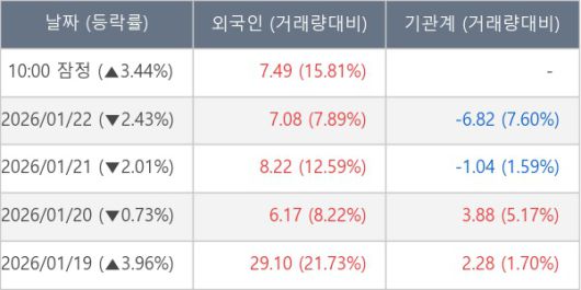[서울=뉴스핌] 로보뉴스 = 23일 10시 15분 현재 한화엔진(082740)은 전일 대비 3.44% (현재가 54,100원) 상승했고, 외국인이 최근 8일 연속 순매수(누적 94.74만 주, 잠정) 행진을 하고 있다.