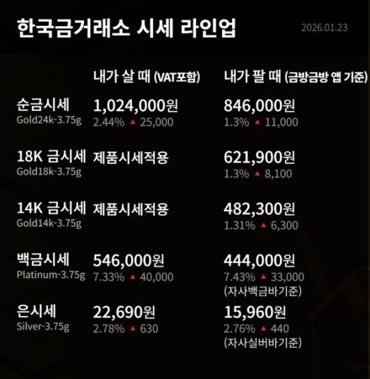 (더쎈뉴스 / The CEN News 한나래 기자) 2026년 1월 23일 한국금거래소 시세에 따르면 순금(24K·3.75g)의 살 때 가격은 전일 대비 2.44%(2만5,000원) 상승한 102만4,000원을 기록하며 강한 오름세를 이어갔다. 팔 때 가격 역시 84만6,000원으로 1.3%(1만1,000원) 상승했다.