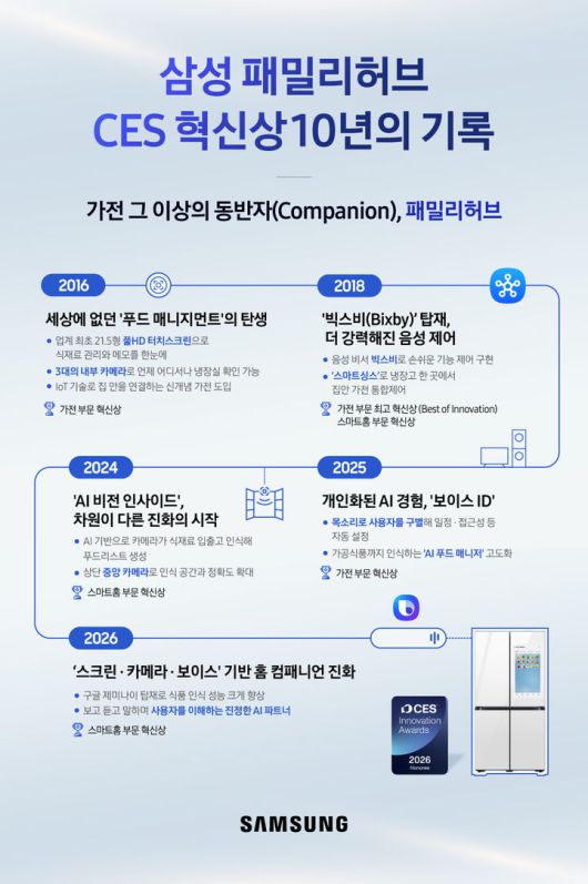 삼성전자에 따르면 2026년 '비스포크 AI 패밀리 허브' 냉장고는 카메라?스크린?보이스 기능이 탑재돼 사용자 일상의 편의를 크게 높였다.