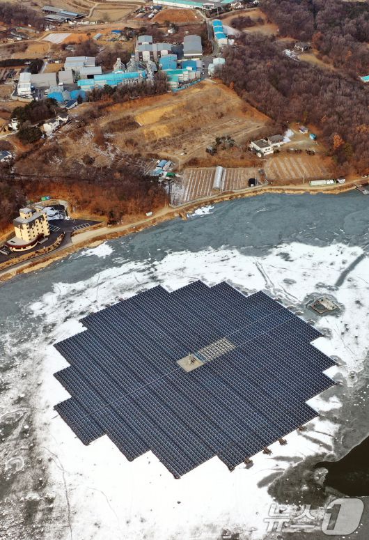 (화성=뉴스1) 김영운 기자 = 연일 북극 한파가 지속되고 있는 23일 경기 화성시 멱우지에 설치된 수상태양광발전소 주변이 얼어 있다. 2026.1.23/뉴스1