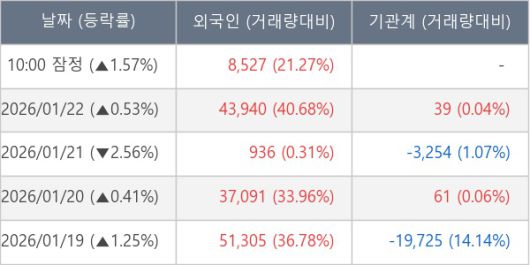[서울=뉴스핌] 로보뉴스 = 23일 10시 15분 현재 이지홀딩스(035810)는 전일 대비 1.57% (현재가 4,850원) 상승했고, 외국인이 최근 6일 연속 순매수(누적 15.56만 주, 잠정) 행진을 하고 있다.