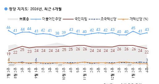 여론조사 전문기관인 한국갤럽은 지난 22일 하루 동안 전국 만 18세 이상 유권자 1000명을 대상으로 정당 지지도를 집계한 결과 민주당이 43%, 국민의힘이 22%를 기록했다고 이날 밝혔다.