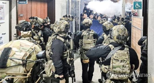 2024년 12월 3일 저녁 비상계엄을 선포된 이후 자정이 지난 4일 새벽 서울 국회의사당에서 계엄군이 국회 본청으로 진입하고 있다. 연합뉴스 |