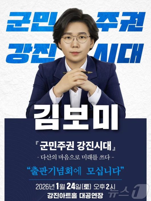 (강진=뉴스1) 박영래 기자 = 6월 지방선거에서 전남 강진군수에 도전하는 김보미 강진군의원(37·여)이 24일 오후 2시 강진아트홀 대공연장에서 저서 '군민주권 강진시대–다산의 마음으로 미래를 쓰다' 출판기념회를 개최한다.