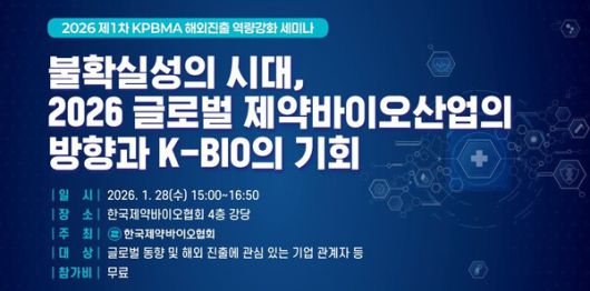 한편, 이번 세미나는 무료로 진행되며, 오는 26일 오후 6시까지 사전 등록을 받는다. 등록 방법 및 세부 프로그램은 제약바이오협회 홈페이지 공지사항을 통해 확인할 수 있다.