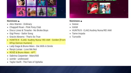 그룹 블랙핑크 로제의 히트곡 '아파트'와 애니메이션 영화 '케이팝 데몬 헌터스'의 대표 삽입곡 '골든'이 영국 최고 권위의 대중음악 시상식 후보로 지명됐습니다.