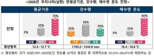 기상청은 전망에서 올해 연평균 기온이 평년(1991∼2020년 평균) 연평균 기온(12.3∼12.7도)보다 높을 확률을 70%, 비슷할 확률을 30%로 제시했다. 평년기온보다 낮을 확률은 0%로 봤다.