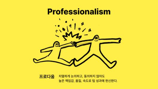- 각자의 역할이 모여 팀의 결과가 된다 : 누구도 혼자가 아니다. 개인의 역할이 모여서 팀이 만들어진다. 이것은 성장지향과 프로다움이 하나로 모인 모습이다.