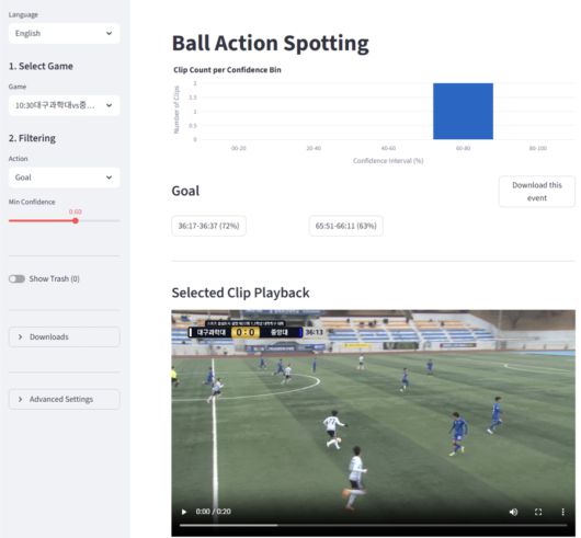 유튜브 중계팀과 스포츠 IT 기업 스포잇이 함께 개발한 POC(개념 검증) 형태로, AI 기반 하이라이트·클립 자동 생성 기능이다.