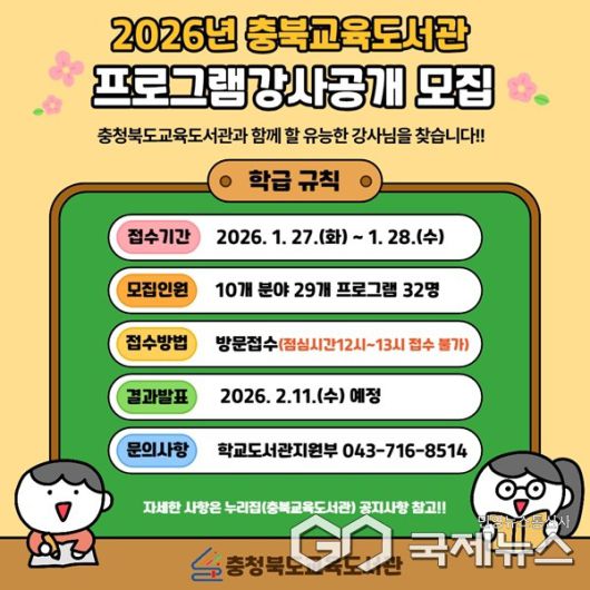 (청주=국제뉴스) 이재기 기자 = 충북도교육청 직속기관 교육도서관(관장 노재경)은 학생과 학부모, 지역주민에게 다양한 배움의 기회를 제공하기 위해 27일부터 28일까지 교육 프로그램 강사를 공개 모집한다.