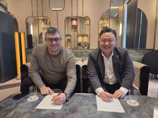 최준호 패션그룹형지 부회장(오른쪽)이 AJ 워너 오프체인랩스 최고전략책임자(CSO)와 스테이블코인 기반 디지털 결제 인프라 개발 협력을 위한 MOU를 체결하고 있다.(사진=패션그룹형지 제공) *재판매 및 DB 금지 |