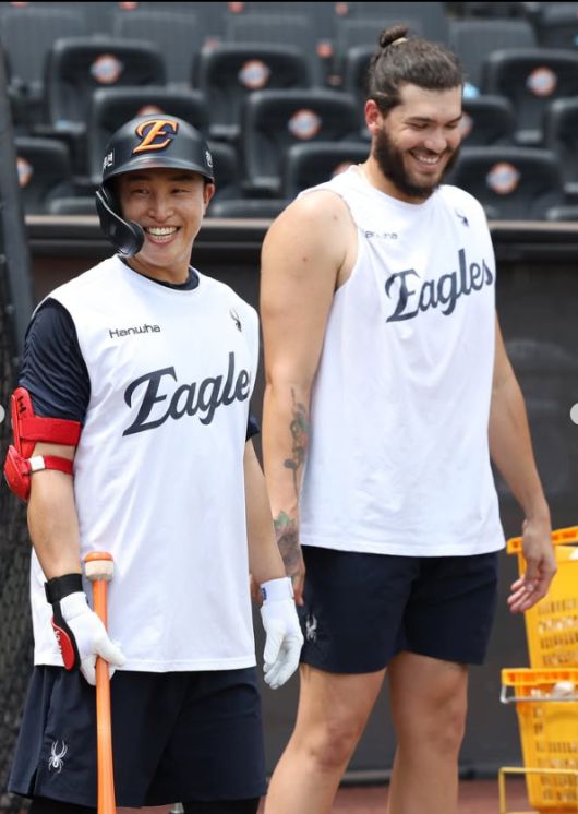 [서울=뉴스핌] 장환수 스포츠전문기자= 지난해 시즌 중 NC에서 한화로 이적한 뒤 에이스 코디 폰세와 함께 활짝 웃고 있는 손아섭(왼쪽). [사진=한화] 2025.08.07 zangpabo@newspim.com |