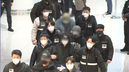 캄보디아에서 송환된 한국인 피의자 73명, 앞서 착륙 장면 보여드렸는데 현장에서 수속을 마치고 지금 피의자들이 공항에 모습을 드러내고 있습니다.