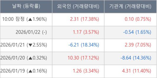 [서울=뉴스핌] 로보뉴스 = 23일 10시 15분 현재 일진전기(103590)는 외국인과 기관이 각각 2.31 만 주, 0.10 만 주 순매수(잠정) 하면서 전일 대비 1.96% (현재가 62,300원) 상승하고 있다.