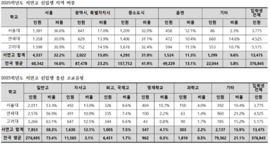 서울대는 신입생 3775명 중 36.6%(1381명)가 서울 출신이었으며, 연세대는 4525명 중 30.0%(1358명)가, 고려대는 5175명 중 30.9%(1598명)가 서울 출신이었다.