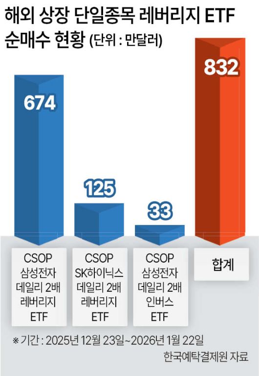 실제 국내 투자자들은 국내 증시 특히 반도체주가 급등하자 레버리지 상품을 찾아 해외로 이동했다. 한국예탁결제원에 따르면 개인은 최근 한달 간 홍콩 자산운용사 CSOP의 삼성전자 데일리 2X 레버리지 ETF와 SK하이닉스 데일리 2X 레버리지 ETF를 각각 674만달러, 125만달러 순매수했다. 삼성전자 데일리 2X 인버스 ETF도 33만달러 순매수했다. 높은 보수율(1.60%)과 고환율 부담을 감수하면서까지 국내 종목 레버리지 ETF에 투자하고자 해외 시장에 직접 나선 셈이다.