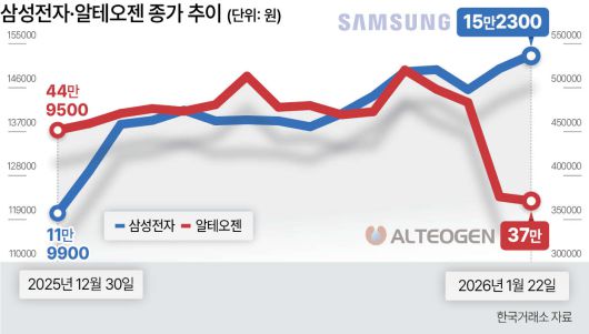 각 시장 시총 1위 종목의 흐름 차이도 뚜렷하다. 삼성전자 주가는 지난해 연말 대비 22일까지 종가 기준 26.99%나 급등한 15만2300원까지 치솟았다. 코스피 지수 상승률을 약 9%포인트 이상 웃도는 성과다. 대장주가 지수보다 더 강한 상승세로 지수 상승을 견인했다는 분석이다.