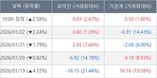 [서울=뉴스핌] 로보뉴스 = 23일 10시 15분 현재 한국카본(017960)은 외국인과 기관이 각각 0.69 만 주, 0.50 만 주 순매수(잠정) 하면서 전일 대비 2.58% (현재가 35,750원) 상승하고 있다.